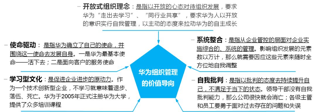 Value orientation of Huawei's organizational management Huawei is a hard entrepreneurial history of the development of Chinese private enterprises. It not only condenses too many hardships and heartaches, but also covers all the "necessary stages" of the development of domestic private enterprises. It can be described as a "living fossil" of the development of private enterprises. Many enterprises have flocked to learn from Huawei, not only because Huawei has made such development achievements today, but also because of the "essentials" for the development of Chinese private enterprises. Huawei has many things. From a small private trading company, it has grown step by step into an "aircraft carrier" in the field of information technology; From a linear management enterprise to a multi matrix organization oriented to regions, customers and products; From a product determined organization to a "customer and strategy determined organization" to a "business determined organization". Among them, the summary and analysis of Huawei's problems, accumulated experience and current challenges in the construction of high-performance teams are conducive to providing practical experience and guidance for further improving the effectiveness of high-performance teams. When it comes to the value orientation of Huawei's organizational management, Huawei consists of five distinct propositions, namely, open organizational philosophy, mission driven, system integration, learning culture, and self-criticism. The advocacy and implementation of these organizations constitute the driving force for Huawei's continuous development (see the figure below).